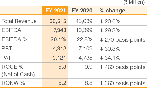 FY 2021 was a challenging year due to the impact of the COVID-19 pandemic and the ensuing economic lockdown globally. The pandemic further impacted demand, production and deliveries. We saw a decline in demand across all major geographies and business segments. As a result, all key performance indicators have been on a negative trend.