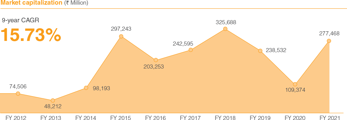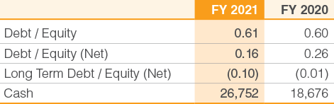 We have effectively used free cash flows in paying off debt, which is an important part of our strategy, to lower debt and finance cost. As a result, our net debt/equity stands at a comfortable 0.16 as on March 31, 2021. We also invest remaining surplus cash in a diversified portfolio (fixed deposits with premium financial institutions and safe liquid instruments) with the aim of generating returns. Our cash and cash equivalents stood at ₹26,752 Million as on March 31, 2021.
